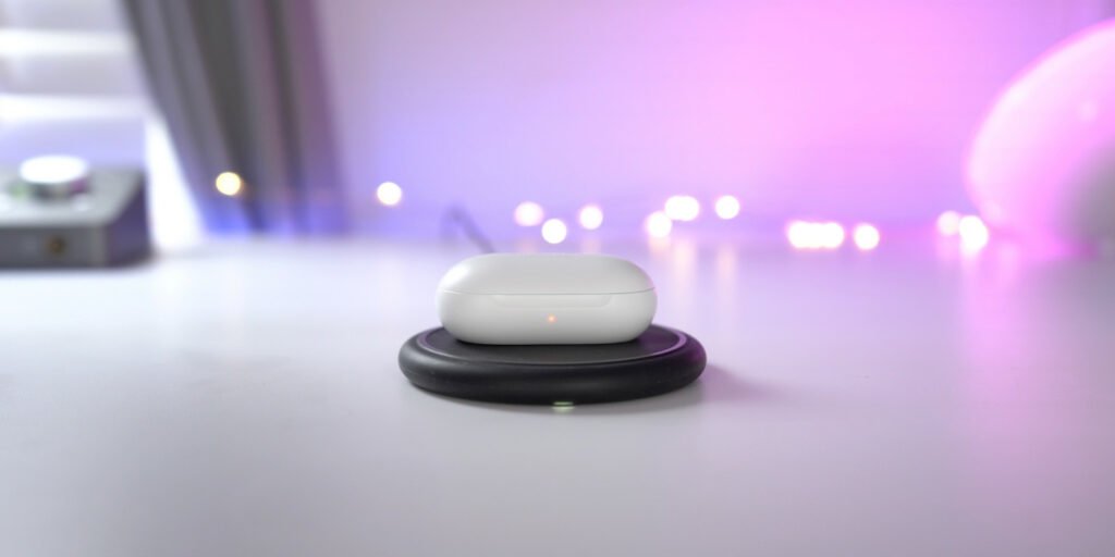 Bár a Galaxy Buds külsőre igencsak eltér az AirPods-tól, a töltésük szinte teljesen megegyezik. Még a töltési szintet mutató LED-ecske is megtalálható a tok belső felének közepén, ami igencsak ismerős mindannak, aki egy AirPods-ról nyergel át a Samsung kütyüjére. Az azonban eltérő az Apple eszközétől, hogy a tok külsejére is került egy LED, így anélkül is megbizonyosodhatunk a fülhallgató töltöttségéről, hogy felnyitnánk a tokot, vagy rácsatlakoznánk vele egy telefonra. A zöld szín azt jelzi, hogy az akksi 60% és a teljes töltöttség között tart, a sárga 30 és 60% közötti állapotot, a piros pedig a 30% és a halál közötti szintet jelez. A villogó LED vagy valamilyen hibát, vagy merülő töltőtokot jelent.